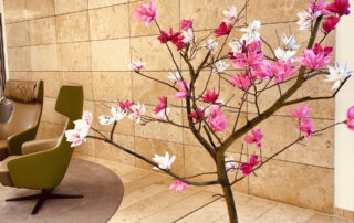 Ulrike Abendschön und Anja Krell, zwei Mitarbeiterinnen des Helmut-Dahringer-Quartiershauses, hatten kürzlich die Idee, ein Magnolienbäumchen mit Blüten aus Krepppapier für das Foyer zu gestalten. Am vergangenen Samstag trafen sich zwölf Bewohnerinnen im Restaurant "Im Quartier", um unter Anleitung der beiden Mitarbeiterinnen die Blüten herzustellen. Zuerst wurden die einzelnen Blüten aus . . .